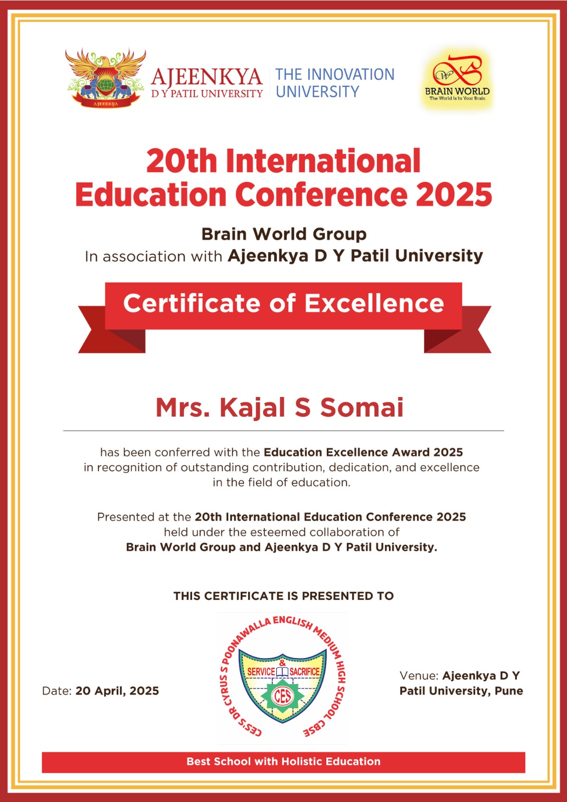 Principal Mrs. Kajal S Somai – Honoured at elets Education Innovation Summit 2022 for her Outstanding Contribution in School Education