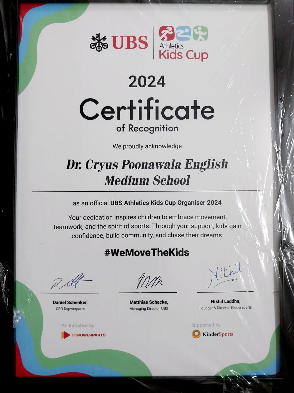 Recognition Certificate for organizing UBS Athletics Kids Cup
